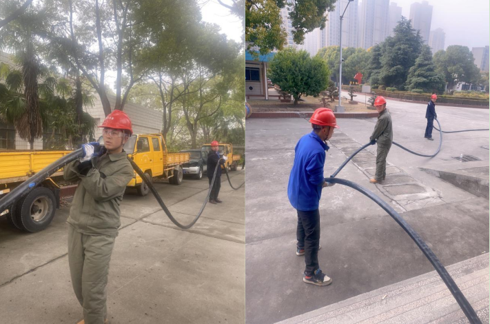大家铆足干劲,用接力形式将手臂粗的电缆沿路传送。