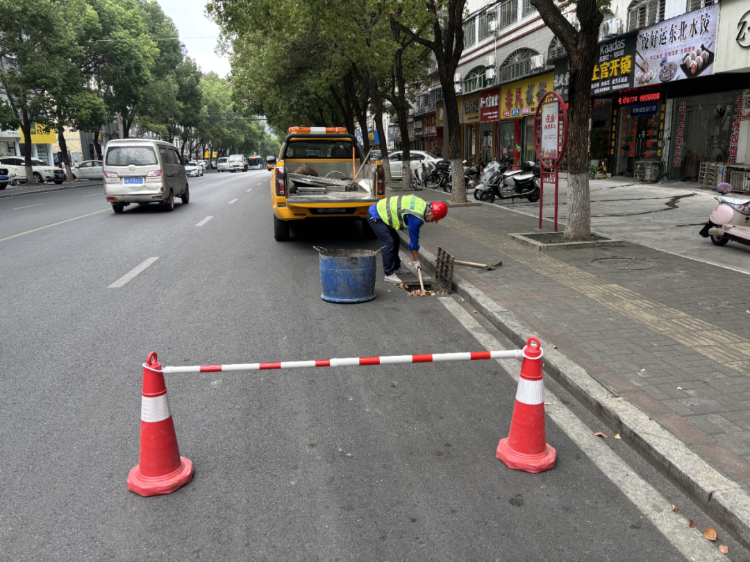 排水公司运维人员正在开启雨水箅盖进行清淤