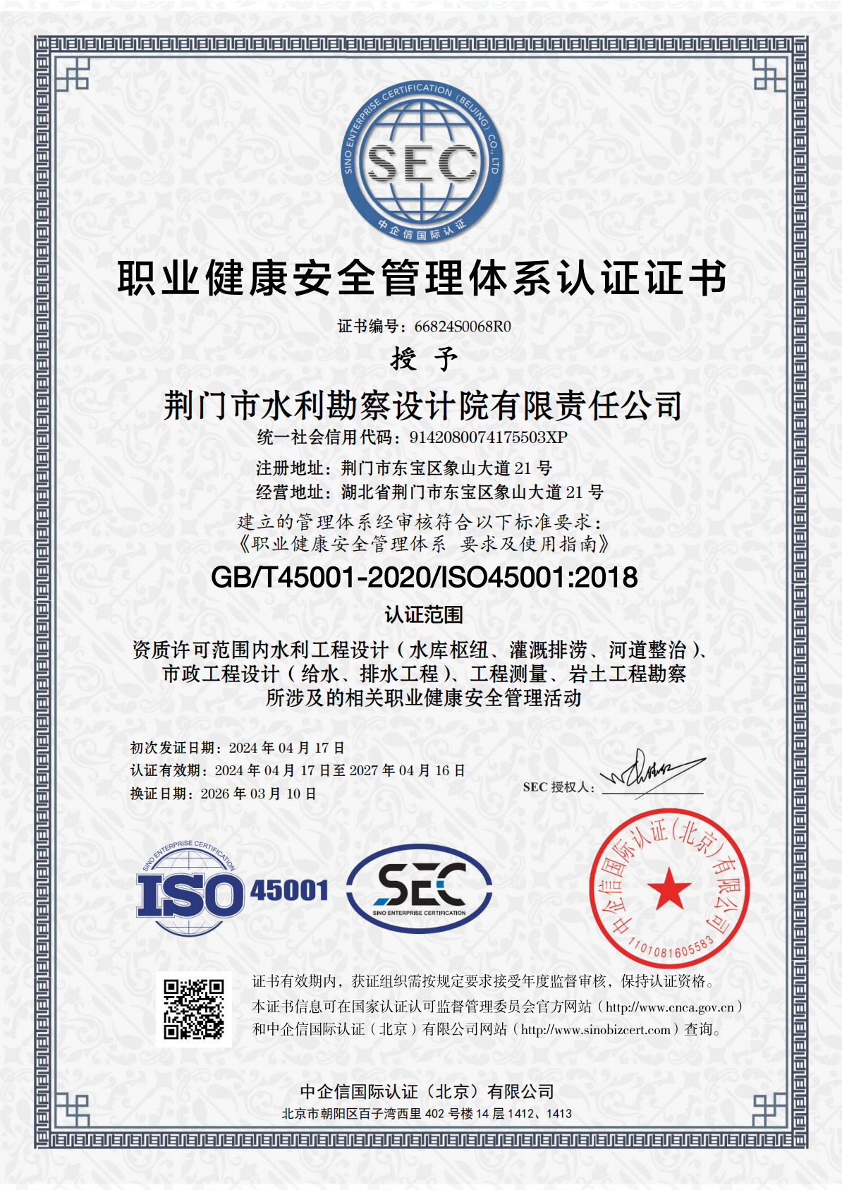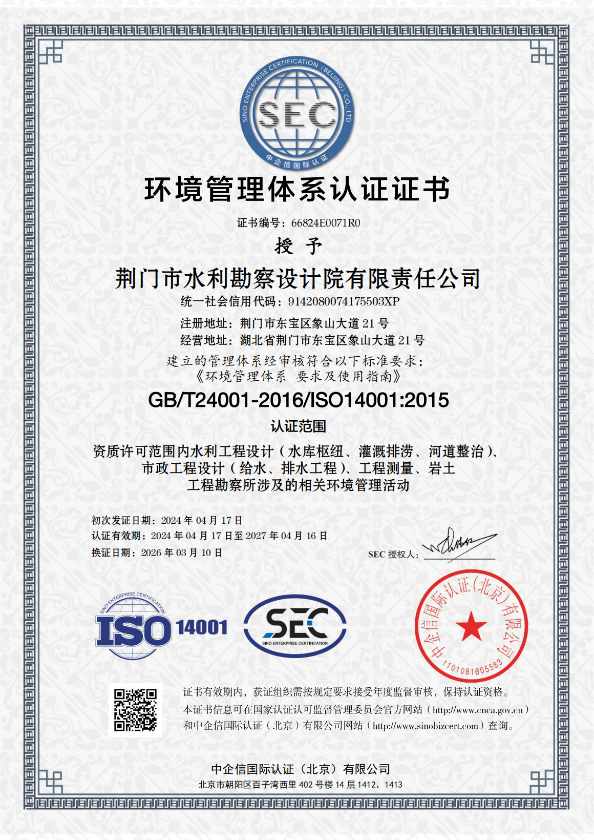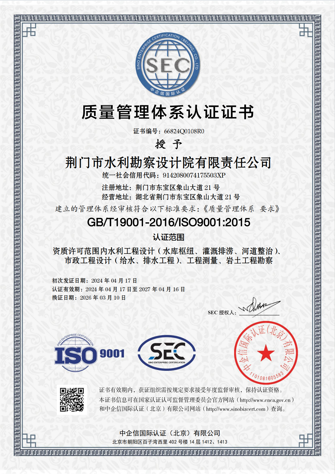 近期,市凯发·K8水务集团下属子公司荆门市水利勘察设计院有限责任公司(以下简称“水勘院”)顺利顺利获得QES(质量、环境及职业健康安全)三体系再认证审核,并新增市政工程设计(给水、排水工程)认证范围,这标志着水勘院从水利工程向市政凯发·K8水务工程领域迈出了实质性的一步。